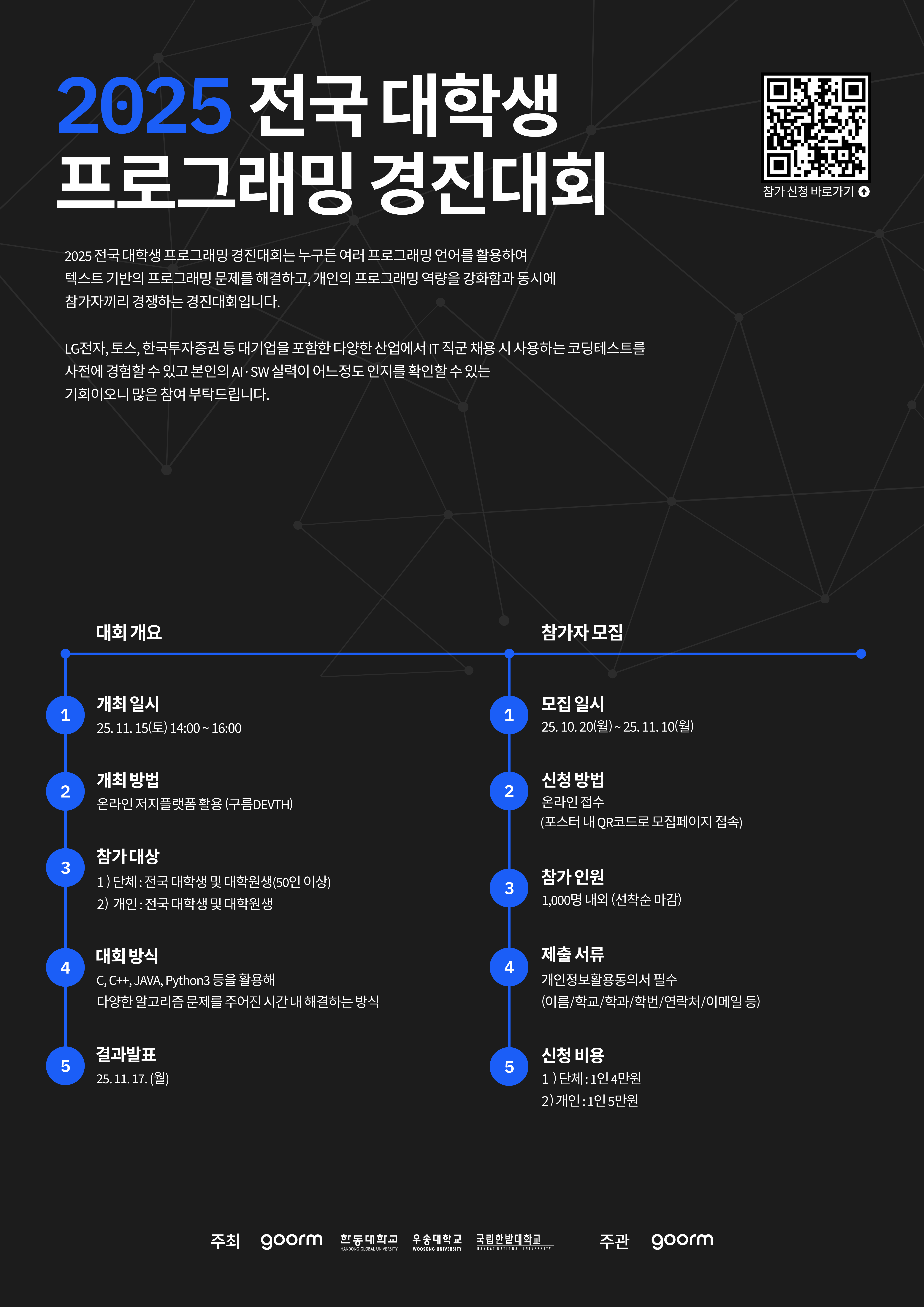 주식회사 구름☁에서는 전국 대학생(대학원생 포함)을 대상으로 SW‧AI 분야로의 신기술 확산과 SW개발 프로그래밍 역량 강화를 위해 경진대회를 개최하오니 많은 참가 바랍니다!
