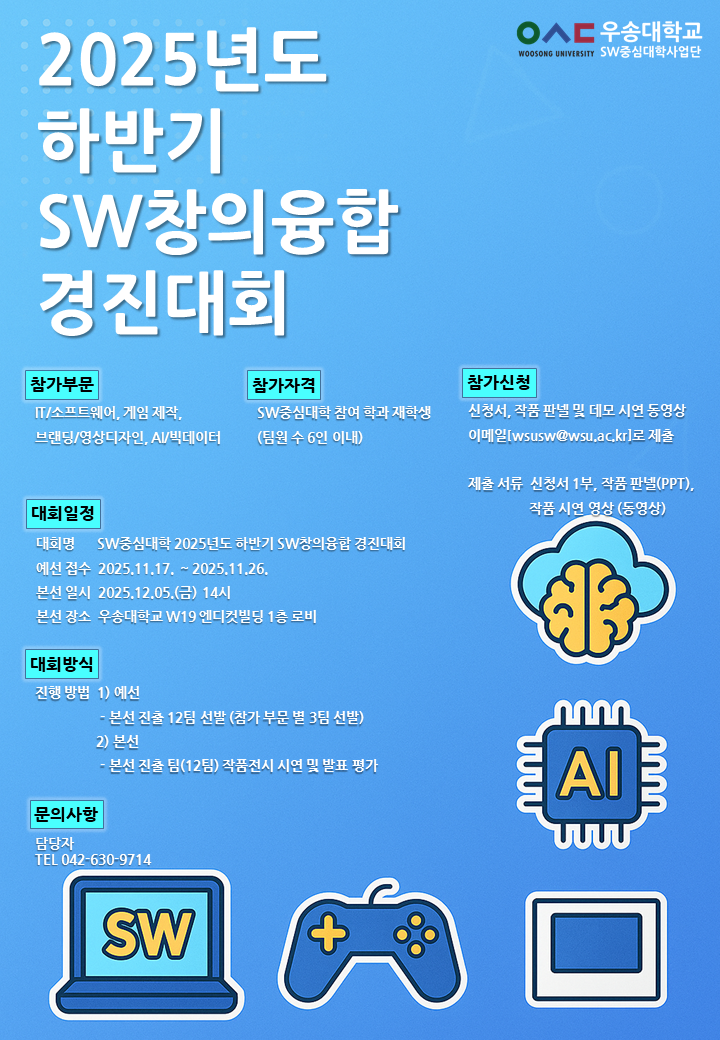 <SW중심대학 2025년 하반기 SW창의융합 경진대회>를 개최하오니 재학생 여러분들의 많은 관심과 참여 바랍니다.