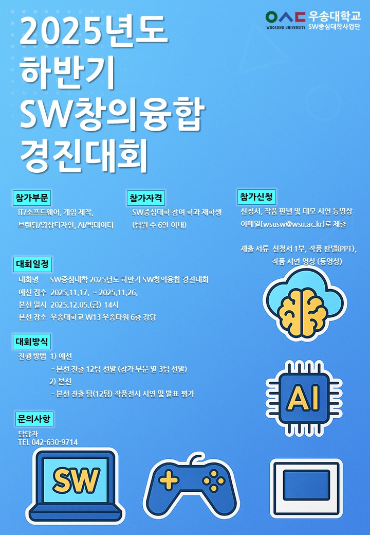 <SW중심대학 2025년 하반기 SW창의융합 경진대회>를 개최하오니 재학생 여러분들의 많은 관심과 참여 바랍니다.